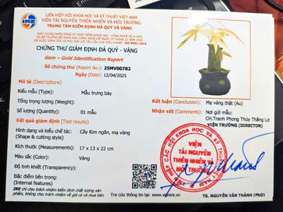 Sản phẩm có giấy kiểm định vàng của Viện Tài nguyên Thiên nhiên và Môi trường